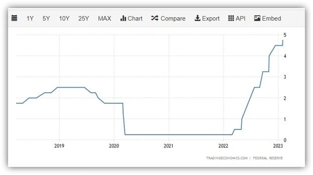 Factor (A): SVB customers moved some of their deposits toward higher returning liability accounts due to rising rates (see fed funds chart below). This pressured Net Interest Margin (“NIM”), the spread between the income generated by investing liabilities and the cost paid on those liabilities.