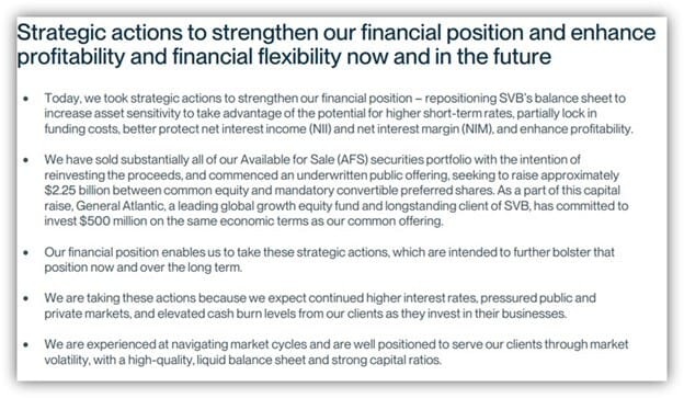 All of this fits within a broader context. First of all, SVB has noted that as asset values on its balance sheet declined amidst the rising rates environment, it effectively faced two options: (1) Take “drip-by-drip” earnings hits on its asset portfolio over several quarters, or (2) “Rip off the band-aid” by rapidly selling this portfolio and deploying the cash into floating rate, higher yielding assets.