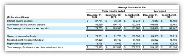 According to SVB’s publicly-available financial statements, since December of 2021, SVB saw ~30% outflows of non-interest bearing deposits (~$36Bn), replaced by only ~$28Bn of more expensive, interest paying deposits. See below: