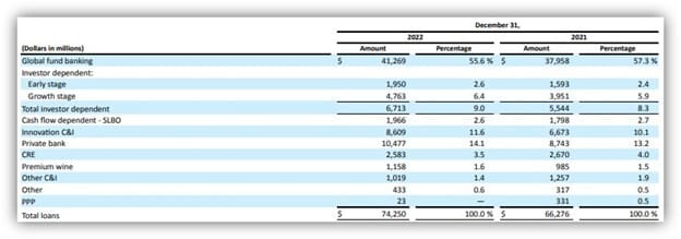 The reason SVB mattered so much to the PE / VC community today is because of its Global Fund Banking business. SVB provided lines of credit, subscription lines and cash / treasury / deposit management to the industry, among other financial services. As you can see in the 10-K disclosure below, Global Fund Banking represented >50% of SVB’s total lending business ($42Bn on a $74Bn lending book).