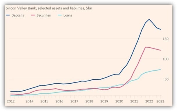 As all of this was happening on the liability side, SVB was beginning to face pressure from the investments it previously made with deposits received in a prior, more expansionary period. As the Financial Times reported, “SVB’s core customers, tech start-ups, needed somewhere to put the money venture capitalists were shoveling at them. But SVB did not have the capacity, or possibly the inclination, to make loans (light blue line) at the rate the deposits were rolling in. So it invested the funds instead (pink line) — overwhelmingly in long-term, fixed-rate, government-backed debt securities.”