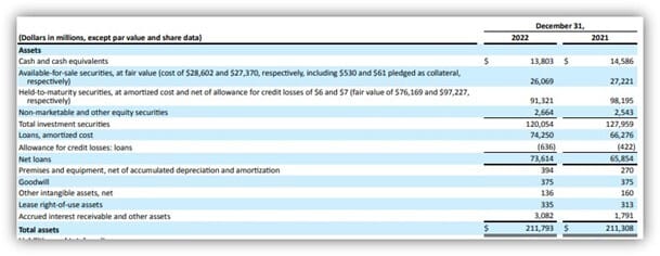 As you can see, the pink line in the chart above sat as an asset on SVB’s balance sheet. Specifically, SVB’s balance sheet was 50% invested in non-marketable securities ($120Bn of its $212Bn assets):